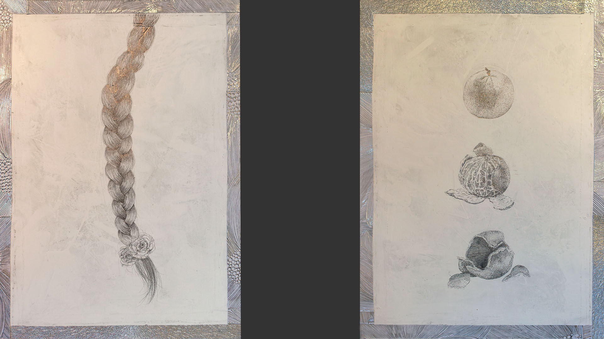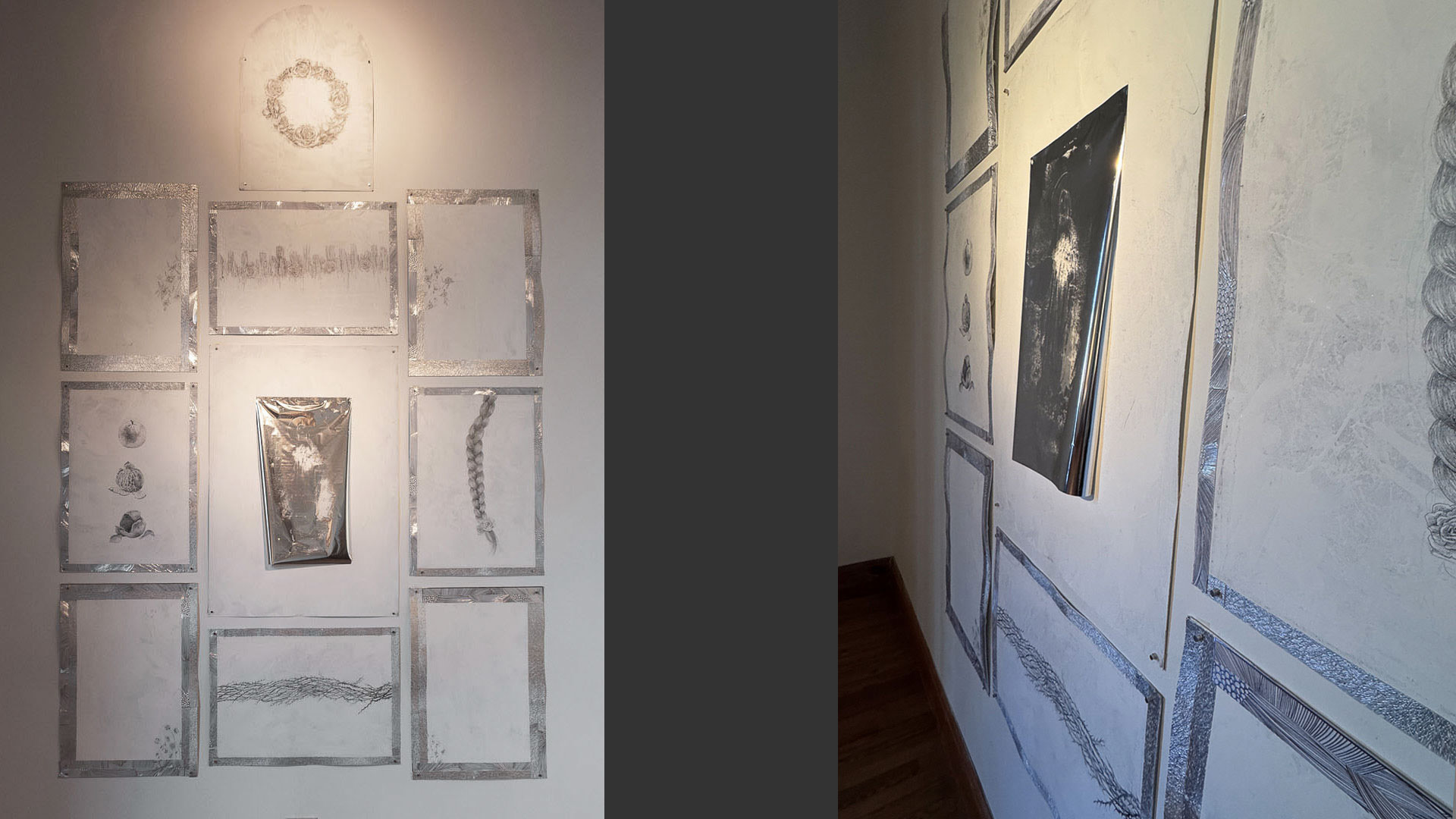 Esta instalación en formato altar, realizada no en oro y madera como sucedería tradicionalmente, sino con materiales non sanctos como cartón, plástico y grafito, habla de lo efímero y lo desechado sin buscar exaltar lo sagrado. La devoción permanece, aunque erosionada y fragmentada. La devoción aquí no es una verdad firme sino un desgaste constante en el intento de sostenerse. En el centro, la Virgen se presenta como una imagen en negativo. Remite al manto que, según la tradición, conservó el rostro de Cristo, pero aquí esa huella es la sombra de María. La figura no ofrece consuelo, se vuelve una presencia que exige sin prometer e interpela sin mirar. A su alrededor, cabellos, espinas, naranjas y velas aparecen dibujados en grafito. Cada uno alude al cuerpo y a la entrega silenciosa. Un sacrificio que ocurre sin ser visto. Una fe que se ejerce sin recompensa. La obra no busca producir fe, sino exponer sus mecanismos: lo que pide, lo que cobra, lo que deja. Este altar no es una promesa. Es una pregunta abierta que permanece en el cuerpo del espectador. ¿Cuánto puede ofrecerse antes de desaparecer? ¿Cuándo deja de ser fe y se vuelve castigo?