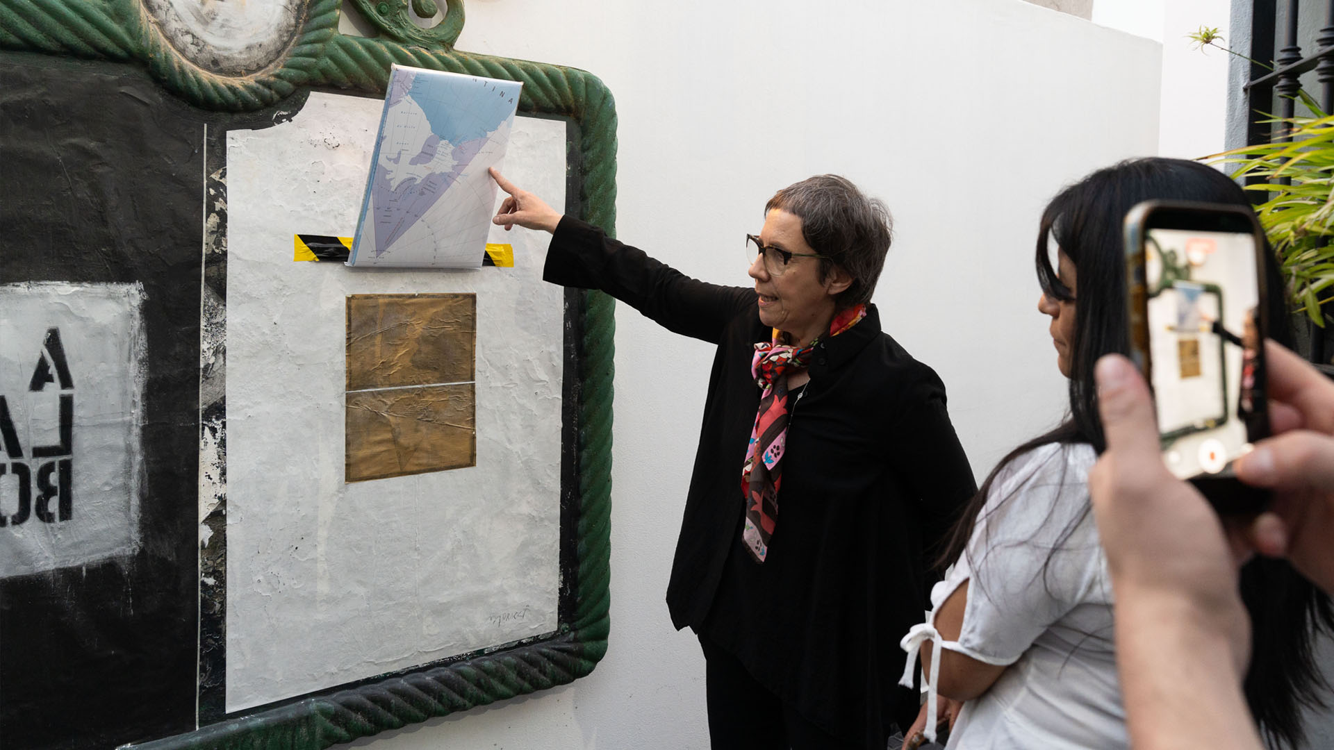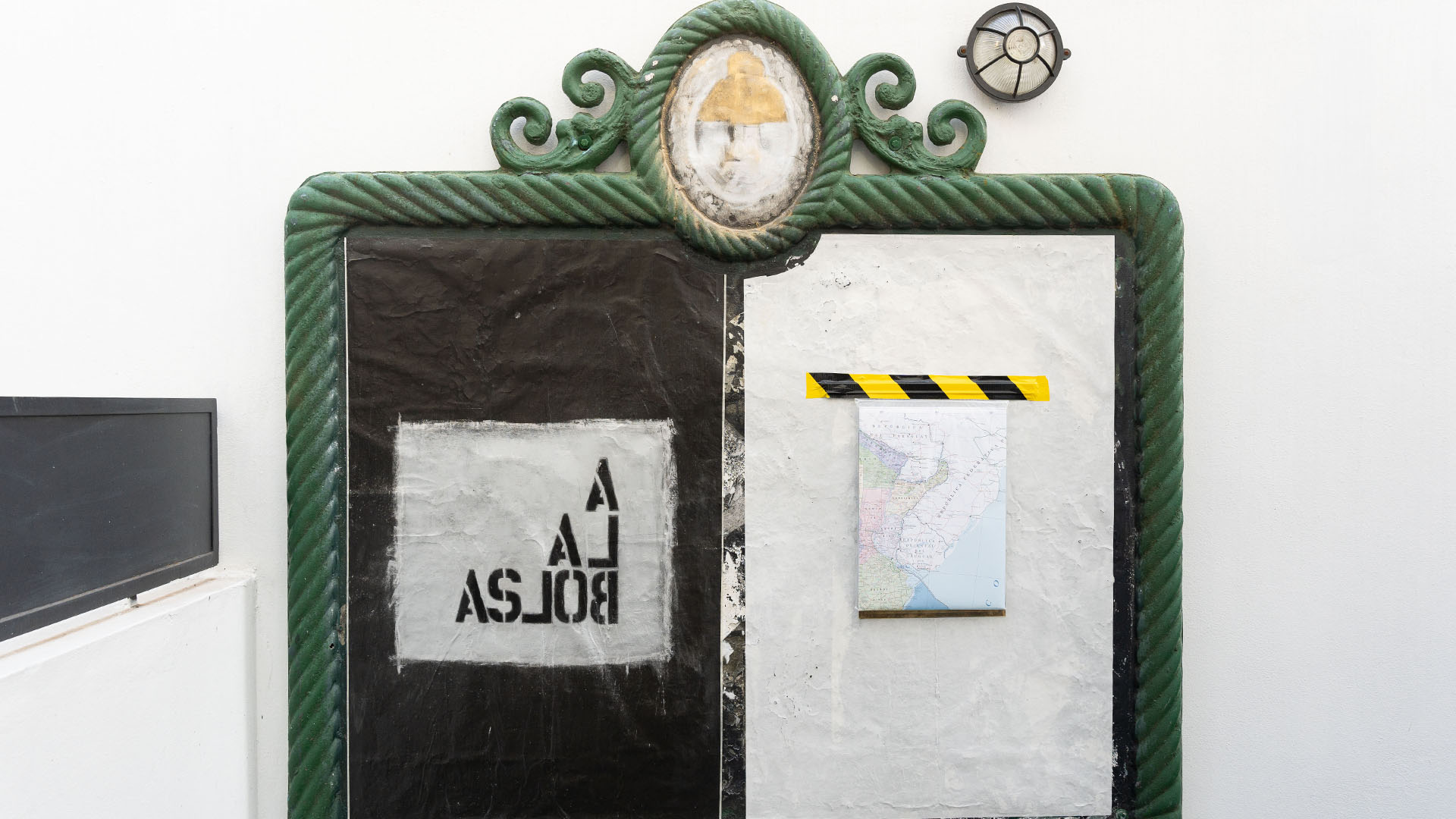 Invitada a intervenir en el Proyecto Carapantallas en el mes de nuestro 20vo aniversario, Adriana propone una lectura en capas: el brillo plateado y dorado, la inscripción invertida A LA BOL$A, una bolsa plástica que encierra el mapa plegado de la República Argentina bicontinental, el mismo mapa desplegado sobre el cartel, y una cinta de precaución que atraviesa la escena. Cada elemento funciona como símbolo y advertencia, como señal que nos obliga a mirar de nuevo aquello que solemos dar por sentado: territorio, valor, pertenencia, extractivismo, frontera.