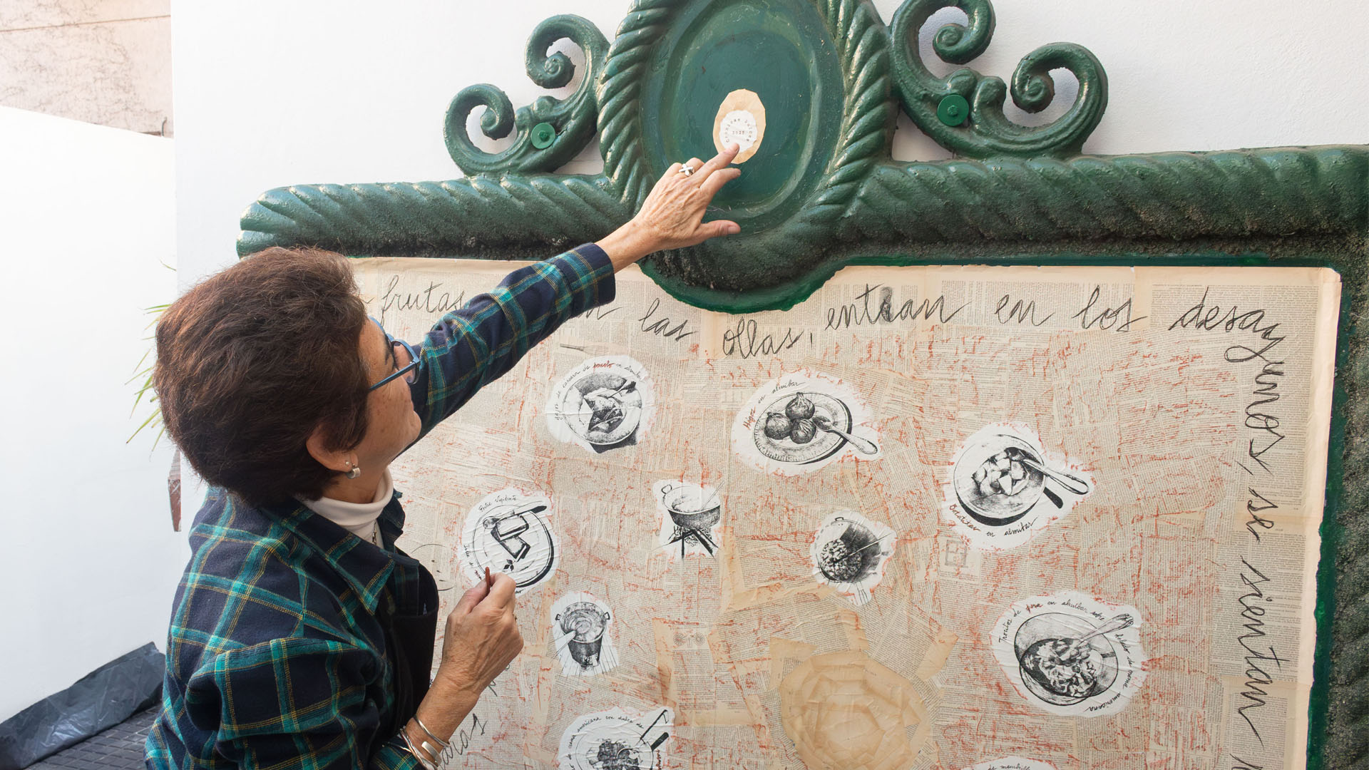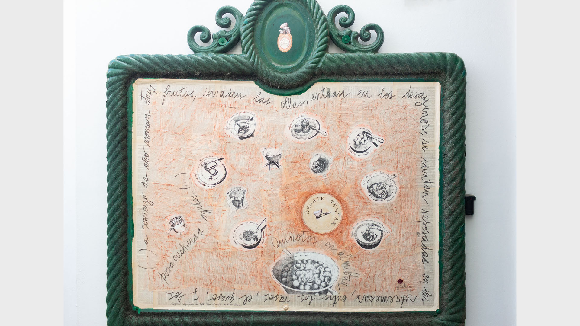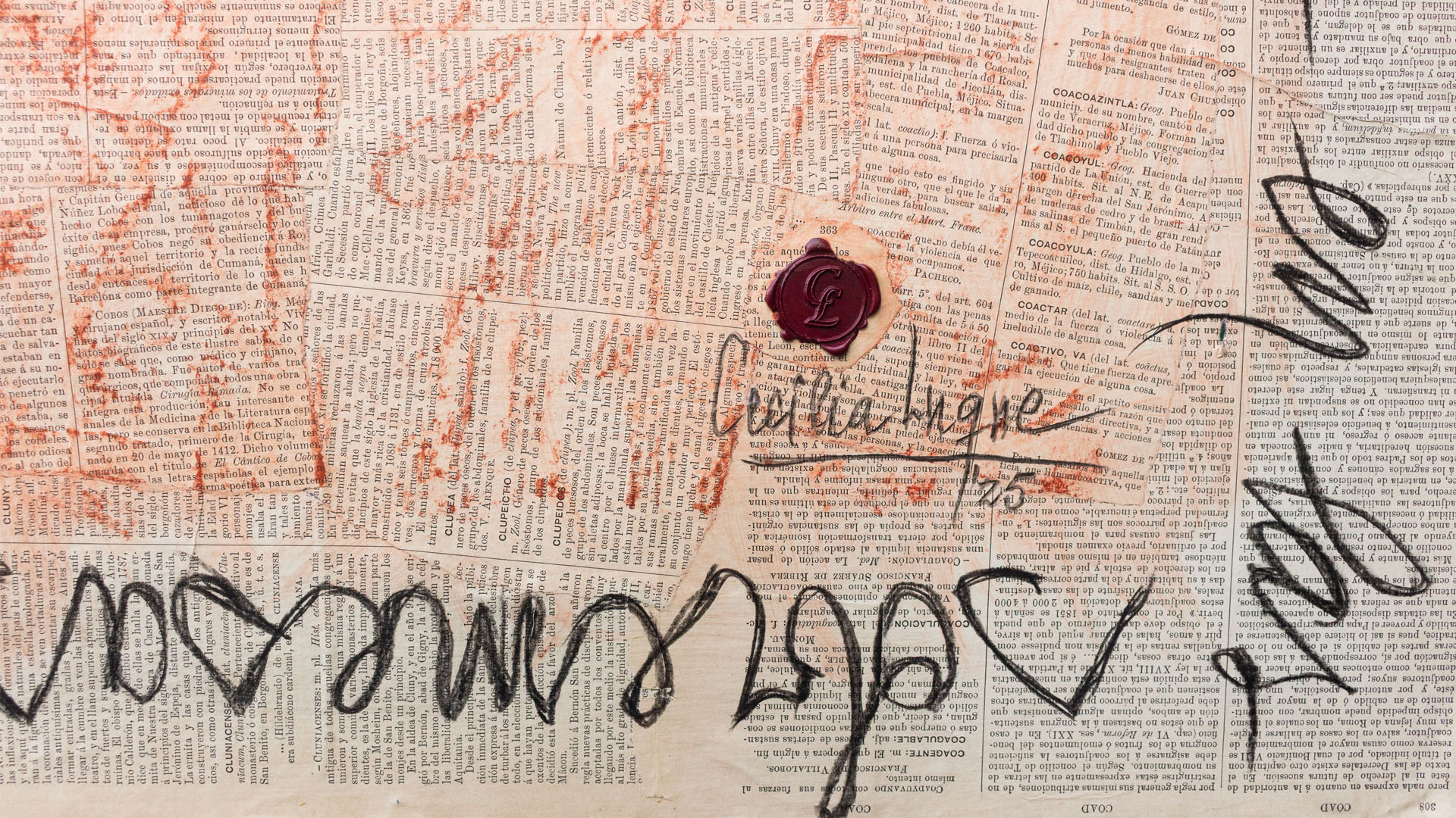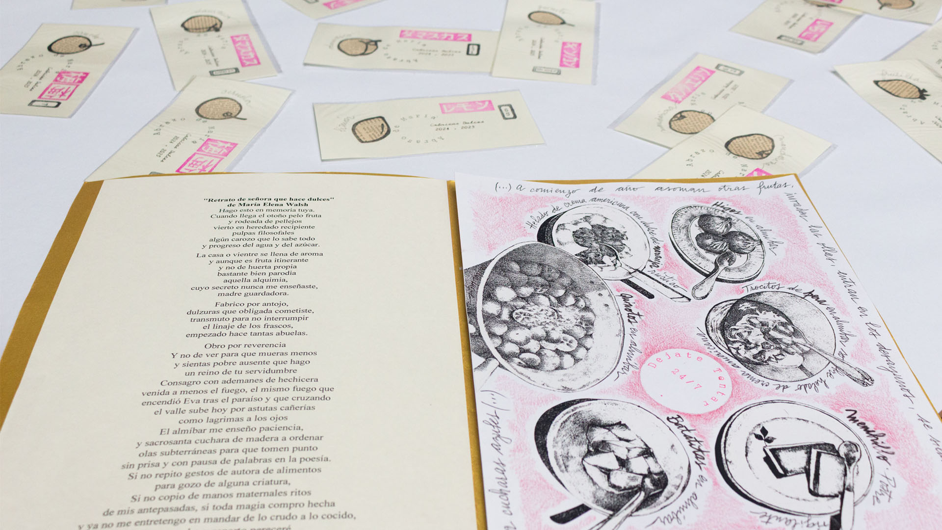 En julio de 2025, fue el turno de la artista visual y grabadora Cecilia Luque de participar del Proyecto Carapantallas. Su intervención, titulada Crónicas dulces, dio continuidad a una línea de trabajo que explora la relación entre memoria afectiva, prácticas gráficas y acciones solidarias. Como tal, Crónicas dulces partió de un gesto generoso: la preparación de dulces caseros por parte de la artista para compartir con el público presente. A partir de esta práctica, íntima y doméstica, Cecilia elaboró una obra que entrelaza el saber artesanal con la materialidad del grabado, la palabra y el archivo. La instalación resultante se compone de collages realizados sobre hojas de una enciclopedia latinoamericana que data del año 1888, combinadas con fotocopias de dibujos de la artista, sellos de goma, textos impresos en barra grasa negra y detalles en sanguina.