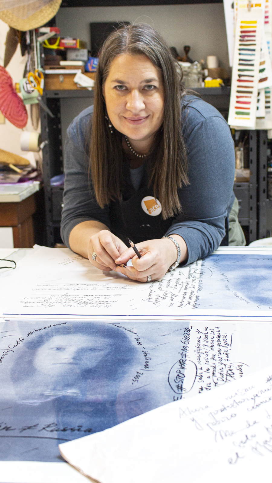 Ioulia presentó en el Espacio Diálogo parte de la producción que realizó durante las 4 semanas de ru residencia en nuestro taller, exponiendo ediciones en papel con motivos vinculados a su historia familiar y a la actualidad bélica en la que se encuentra su país natal. Además, fue invitada por Alicia Candiani a participar de la exposición internacional itinerante El mundo ES/EN un pañuelo (con curaduría de Cecilia Mandrile) como parte de la genealogía de Proyecto´ace, para la cual produjo especialmente una pieza vinculada con los lineamientos teóricos del proyecto.