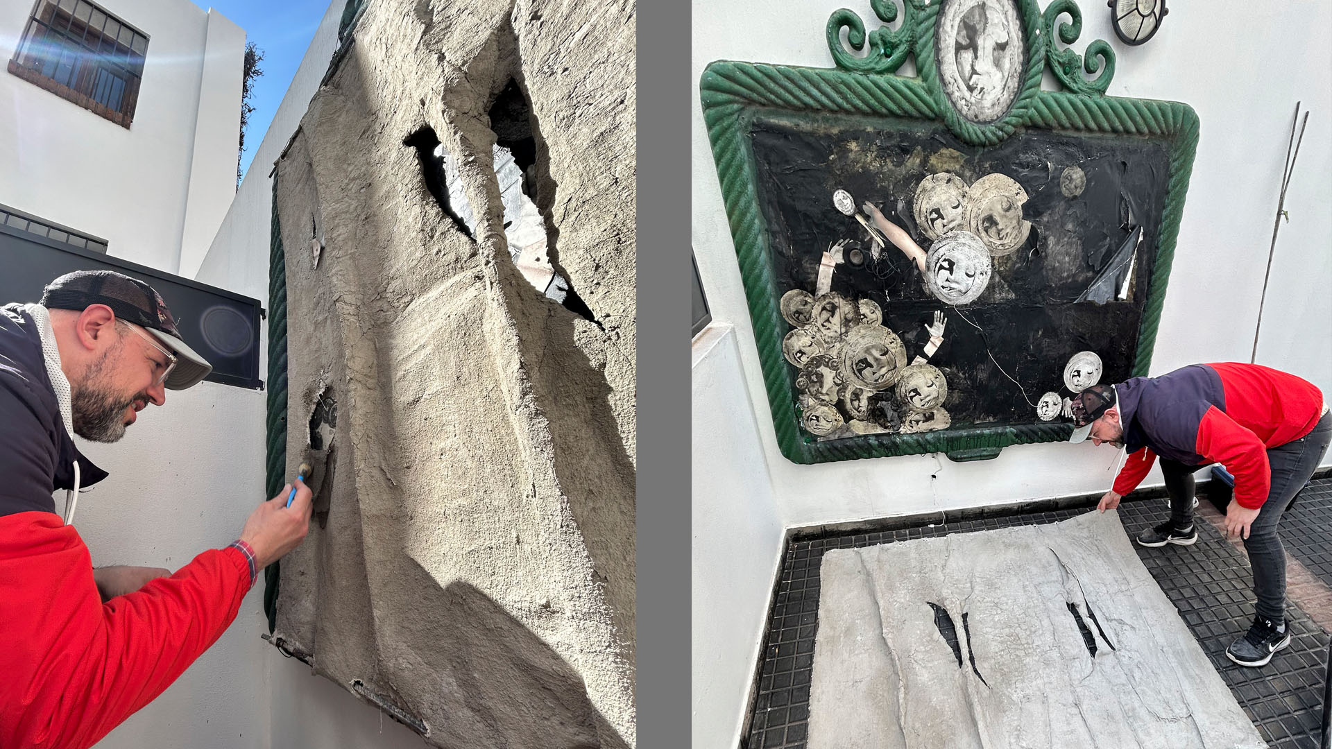 En el marco del Proyecto Carapantallas, inauguramos el 27 de agosto la intervención de Cristián Battista, artista visual y arquitecto argentino. En esta ocasión, Cristian intervino uno de los dos carapantallas con un lienzo pintado de cemento, alambres de construcción y tajos que dejaban entrever la intervención que se encuentra debajo, realizada anteriormente por Cecilia Mandrile. El trabajo de Cristian Battista explora el concepto de habitar desde lo cotidiano, lo lúdico y lo absurdo utilizando materiales reciclados o reutilizados, desplazándolos de su función original para generar nuevos sentidos en diálogo con la ciudad. En este sentido, su intervención en el Proyecto Carapantallas destacó la dimensión urbana de estos dispositivos de comunicación pública tradicionales de la Ciudad de Buenos Aires. Con un enfoque crítico y poético, Cristian investigó cómo el entorno urbano, sus ritmos y materiales moldean nuestra relación con el espacio, con lxs otrxs y con nosotrxs mismxs.