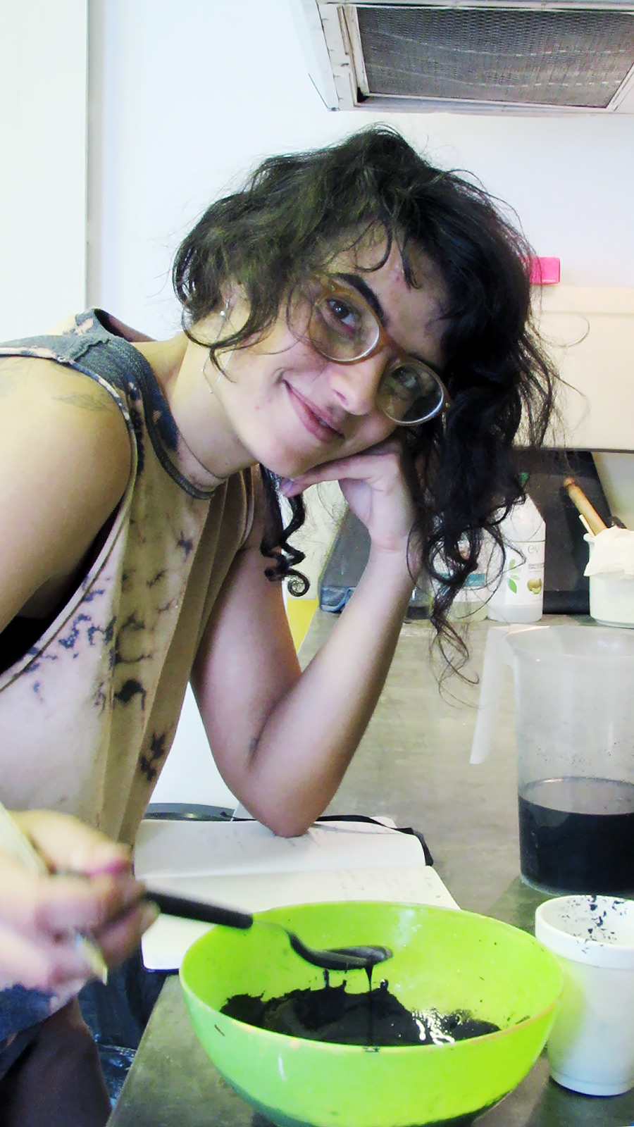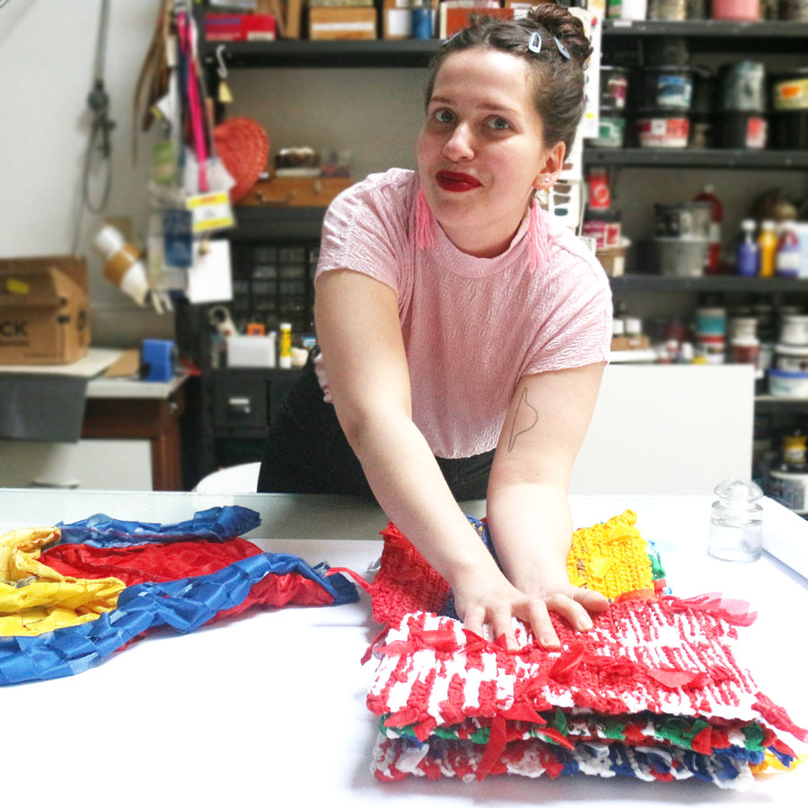 En sus propias palabras: “Me interesa la comodidad que se puede encontrar en los espacios domésticos, o incluso públicos, y cómo se crea esta comodidad, que a menudo es individual. Es algo personal, está formado por la forma en que habitamos nuestros espacios y los objetos de los que elegimos rodearnos. Me interesa saber por qué nos atraen las cosas que nos atraen. Mi proyecto consiste en plantear la cuestión de qué es lo que reconforta a la gente y qué forma el gusto personal, y cómo se relacionan ambas cosas. Combino la pintura con la artesanía textil tradicional como respuesta a esto, teniendo en cuenta mi entorno actual. En mi trabajo me gusta utilizar colores brillantes y contrastados que podrían considerarse «chillones» o «berretas», y me interesa saber de dónde viene esta idea. Los colores brillantes y saturados se encuentran a menudo en los paisajes, en cielos azules que contrastan con verdes, naranjas y rojos intensos. Los diseños de la artesanía tradicional o el arte popular suelen inspirarse en la naturaleza, ya sean los animales que rodean a las personas o el paisaje. Me atraen especialmente los colores utilizados en el arte popular tradicional de Argentina, que para mí imitan los ricos colores del paisaje, y me gustaría incorporarlos a mi proyecto”.
