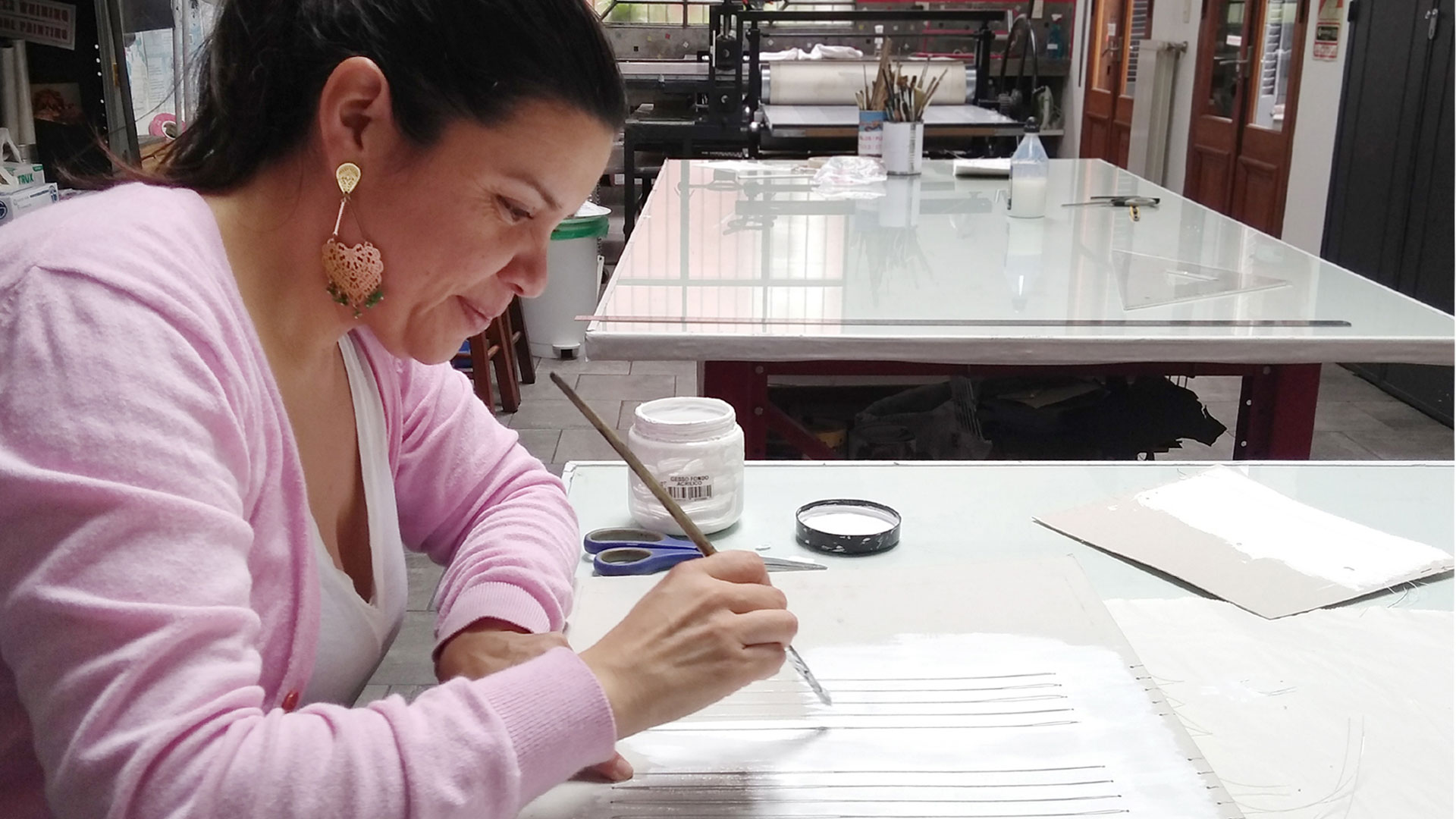 Esta vez en Fundación´ace, he vuelto al grabado, pero al grabado sin tinta y honro al papel. El papel es el soporte de una unión: la palabra no pronunciada y su sonido, tal como en la poesía los silencios son partes elementales del ritmo. Porque los sonidos responden a otra lógica, no aquella de la palabra, sino a una fuerza invisible. Por ejemplo, la fuerza de mi voz, sale desde los pequeños anfiteatros que llevo en mí, que son todos mis órganos, para transformarse en palabras que, por medio de mi aliento, vuelan infinitamente. Estos pentagramas hablan de eso, pero también anuncian todas esas palabras que no se alcanzaron a decir. Es por esto que las matrices juegan una suerte de curtido en el papel. Estos Pentagramas cascabelean amores lejanos, esos que se comunican sin necesidad de traducción. Aquí no hay análogos, cada espacio es libre y único. Estos pentagramas son escritura en libertad y por eso amplifican el sentido visual… esto es quizás uno de sus mejores valores, pues es ahí donde la vida habla de otra manera y las palabras callan…