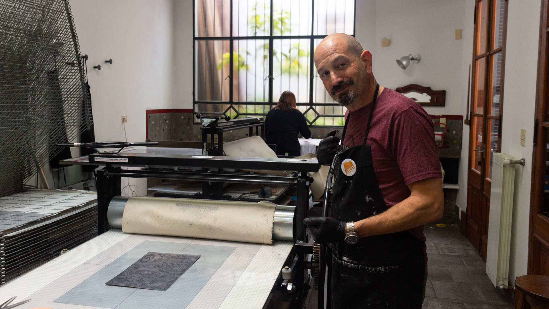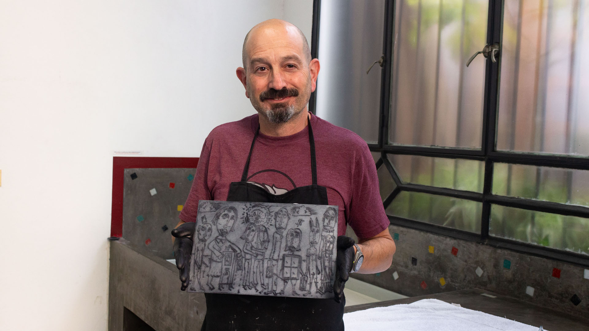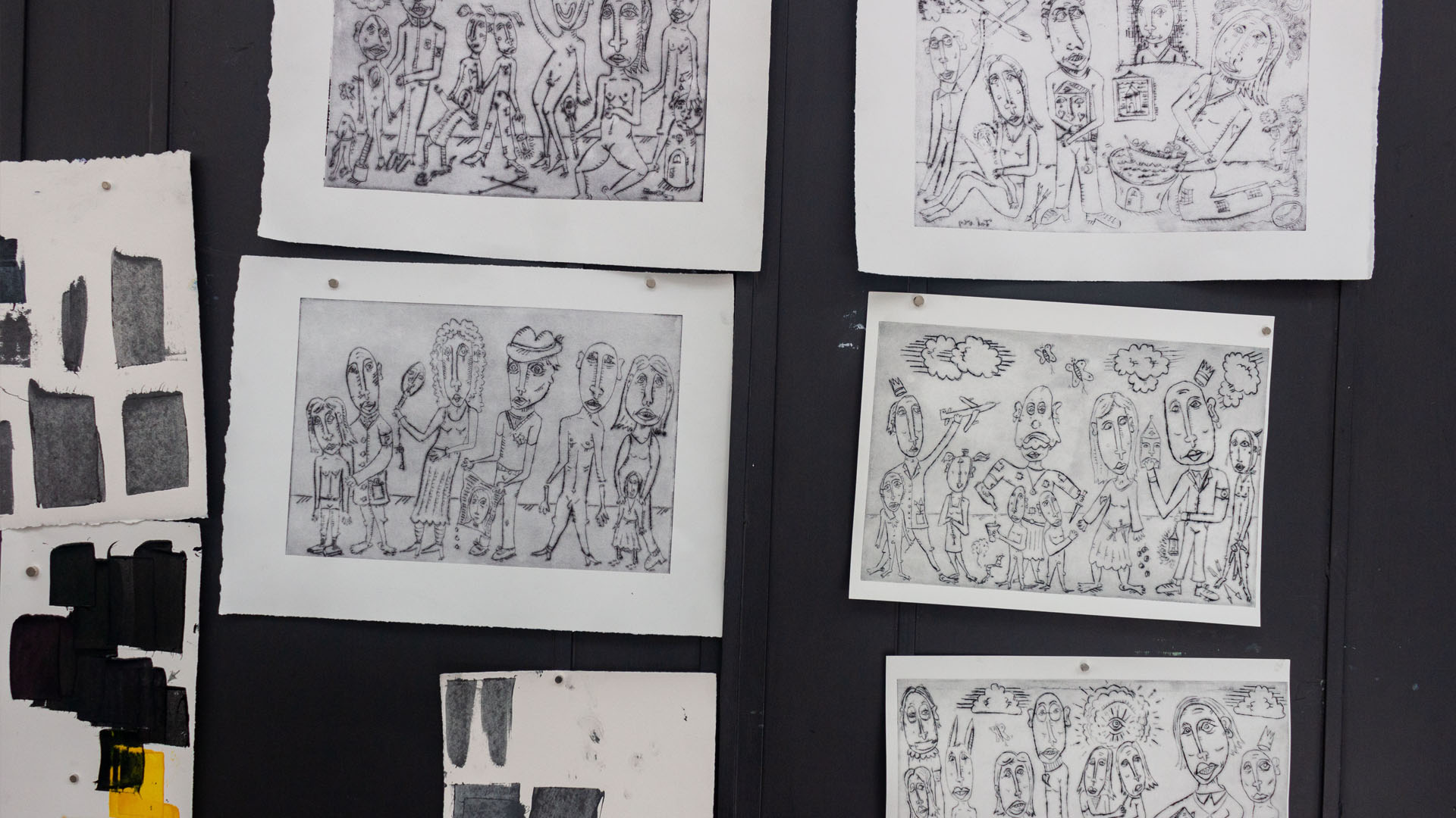 Eric llegó a Proyecto´ace solo con unas pocas herramientas, dejando atrás expectativas, obligaciones y condiciones. En esa simplicidad intencionada, encontró espacio para explorar lo que significa crear libremente, aprender nuevas habilidades y sumergirse en un entorno donde la colaboración forma parte del contexto. Durante su residencia en ´ace, Eric aprendió la técnica de la punta seca para el grabado, convirtiendo así sus dibujos en piezas gráficas por primera vez. En el taller, produjo ediciones en papel de sus expresivos –y a veces humorísticos– dibujos, en los que los símbolos se repiten como fragmentos de una mitología privada: relojes, puertas, ventanas, escaleras, máscaras. Estos motivos, combinados con formas humanas, construyeron un lenguaje visual que exploraba su experiencia de la masculinidad en toda su tensión, ternura y complejidad. El resultado fue un conjunto de obras en las que las formas familiares se reorganizan en nuevas constelaciones, revelando lo que la mente consciente rara vez articula.