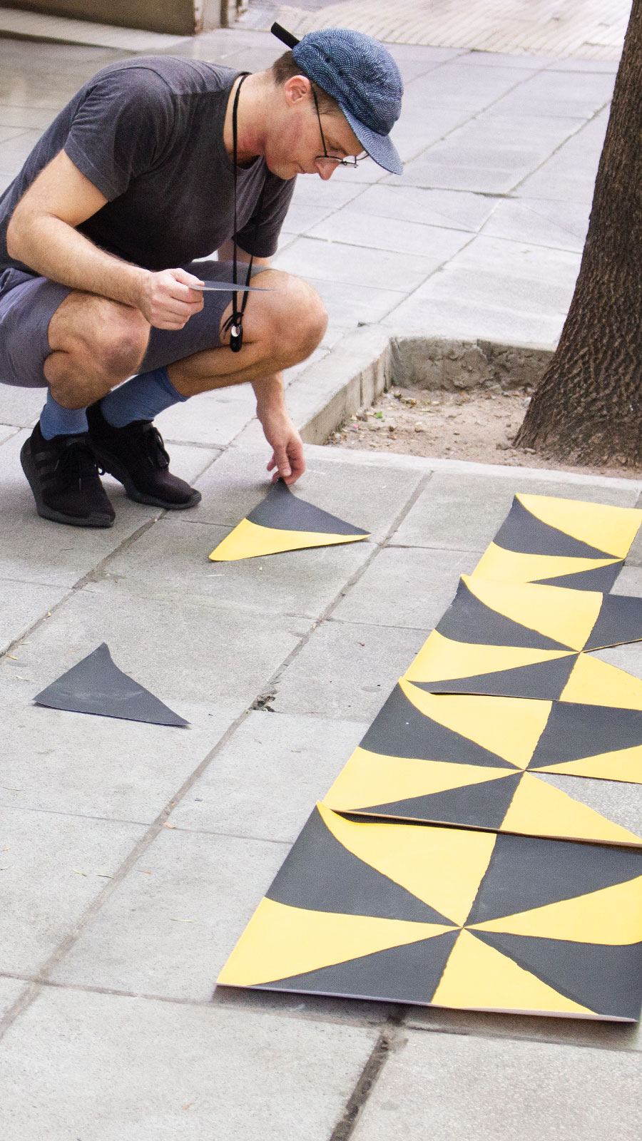 Desde el principio hasta el final, las construcciones de cartón tienen un valor para el artista (el fabricante), el espectador, y por tanto los cartoneros. Geometría de la mano de obra es la culminación del trabajo repetitivo y tedioso: varios cientos de grabados en madera, impresa con un patrón de triángulos blancos isométricos en madera aglomerada, se cortan formando objetos y bajorrelieves en la pared, hojas de cartón ondulado son igualmente transformadas en muebles funcionales y el papel de trapo blanco se convierte en modelo para colocar en el alto techo de la galería, resaltando la arquitectura del espacio.