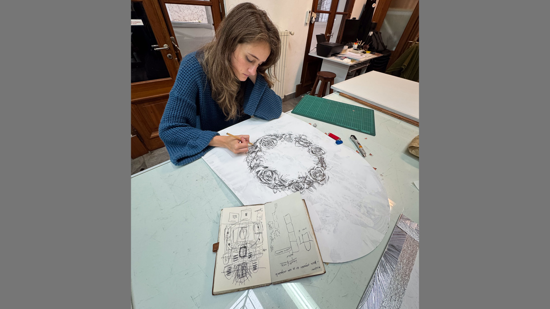 Esta instalación en formato altar, realizada no en oro y madera como sucedería tradicionalmente, sino con materiales non sanctos como cartón, plástico y grafito, habla de lo efímero y lo desechado sin buscar exaltar lo sagrado. La devoción permanece, aunque erosionada y fragmentada. La devoción aquí no es una verdad firme sino un desgaste constante en el intento de sostenerse. En el centro, la Virgen se presenta como una imagen en negativo. Remite al manto que, según la tradición, conservó el rostro de Cristo, pero aquí esa huella es la sombra de María. La figura no ofrece consuelo, se vuelve una presencia que exige sin prometer e interpela sin mirar. A su alrededor, cabellos, espinas, naranjas y velas aparecen dibujados en grafito. Cada uno alude al cuerpo y a la entrega silenciosa. Un sacrificio que ocurre sin ser visto. Una fe que se ejerce sin recompensa. La obra no busca producir fe, sino exponer sus mecanismos: lo que pide, lo que cobra, lo que deja. Este altar no es una promesa. Es una pregunta abierta que permanece en el cuerpo del espectador. ¿Cuánto puede ofrecerse antes de desaparecer? ¿Cuándo deja de ser fe y se vuelve castigo?