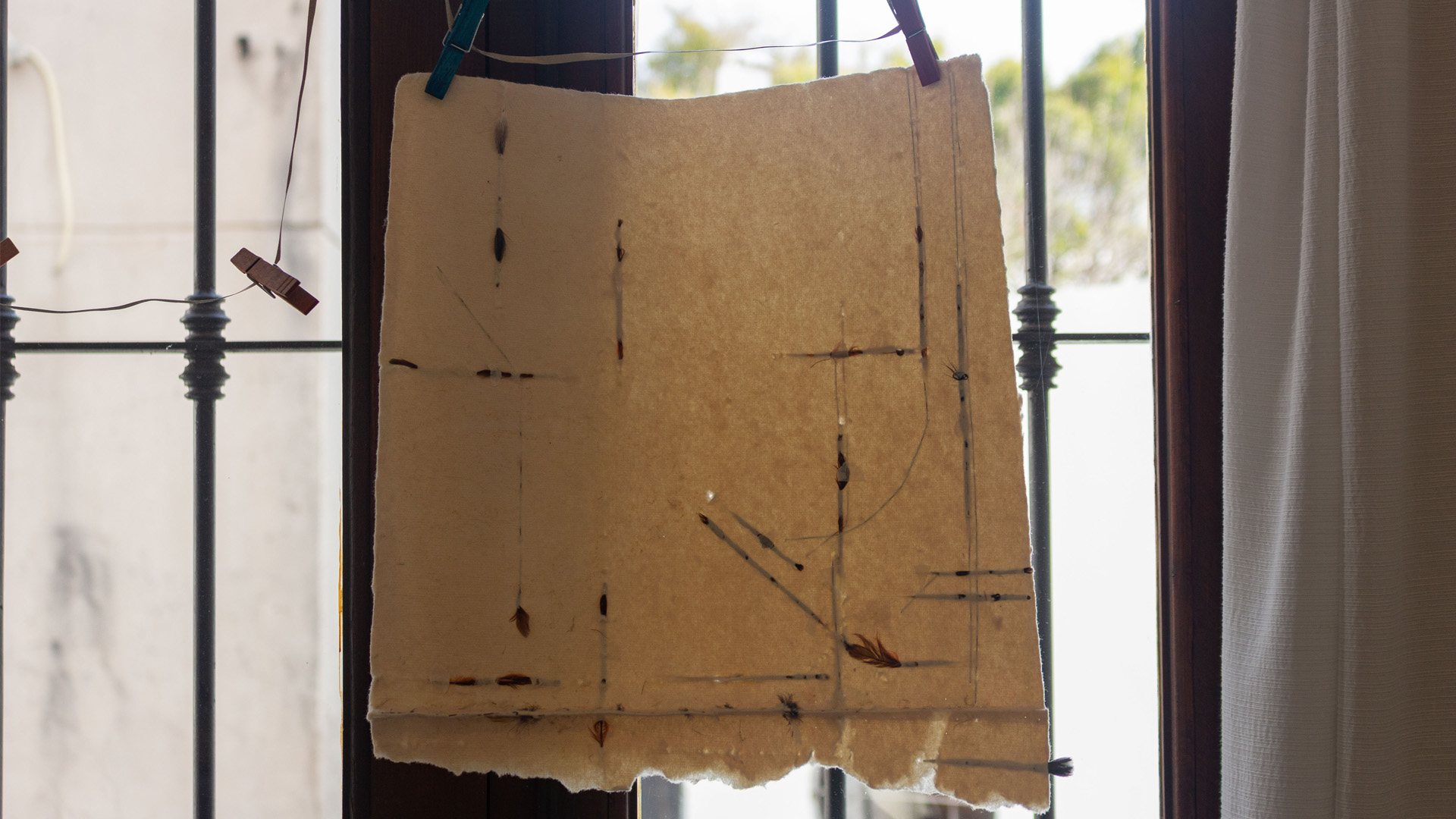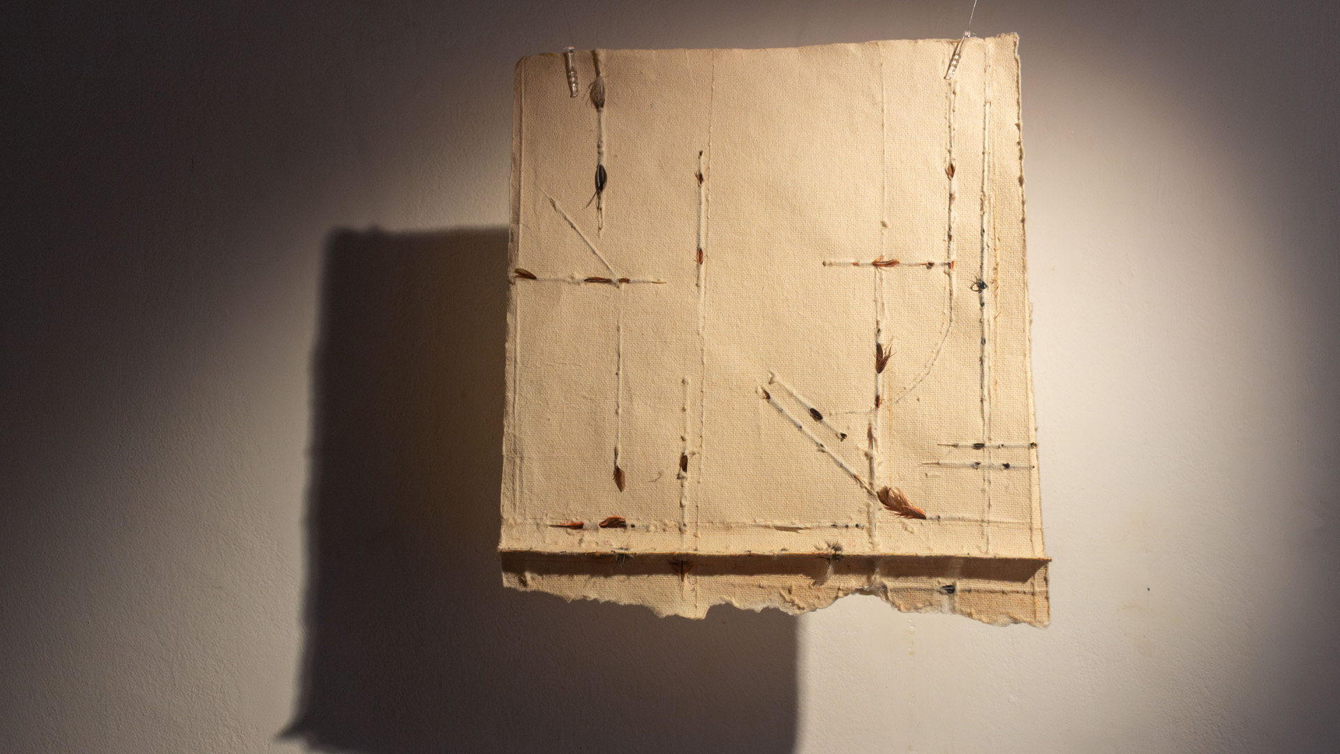 Durante su residencia entre el 4 y el 29 de agosto de 2025 en Proyecto´ace, Valerie Downs desarrolló su serie La Precaria, interviniendo papeles artesanales hechos a mano mediante rasgado, perforación y enhebrado con materiales poco convencionales como su propio cabello, pelo de ciervo, plumas, tierra y óxido. Su práctica —a la que ella misma ha comparado con una “Lazy Susan”, en la que distintas partes de sí misma generan expresiones creativas variadas— cuestiona la noción de materiales “normales” al explorar aquello que somos, cargado de memoria, fragilidad y pulsaciones íntimas.