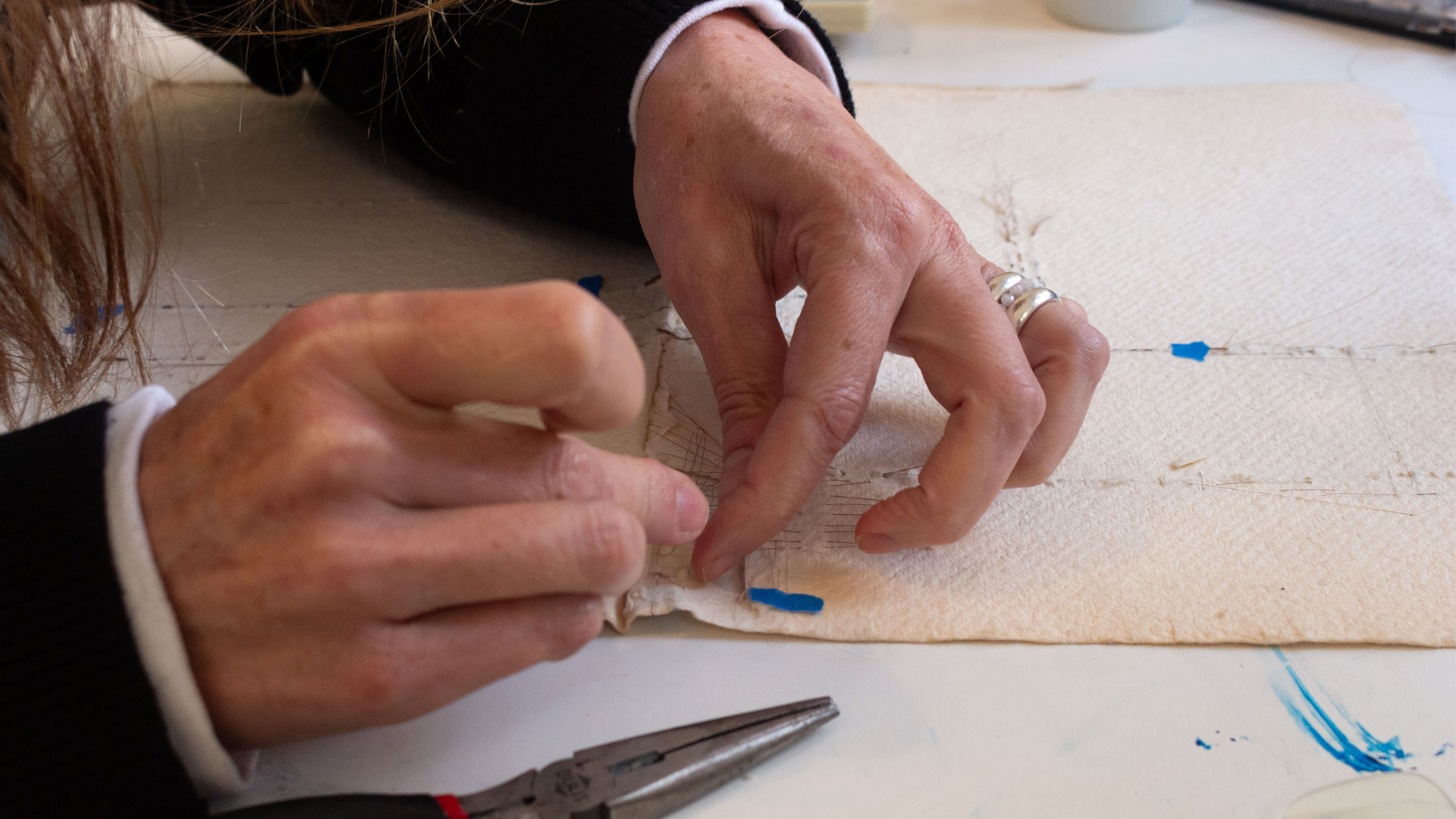 Utilizando elementos que la mayoría pasaría por alto: pelo suelto, plumas, suciedad, óxido y cabello, pido al público que reconsidere las prácticas establecidas. Al aceptar un diagnóstico tardío de neurodiversidad, mi trabajo creado durante esta residencia cuestiona qué son los materiales “normales” y por qué. Al raspar, perforar, coser, recoger y pelar frágil papel vintage hecho a mano, sin darme cuenta liberé la tensión, la culpa y la vergüenza internalizadas mientras trabajaba en lo que significa mi realidad neuroespecífica, cómo se siente y qué consideraciones son necesarias para seguir adelante. La serie resultante, titulada La Precaria, es una representación visual en técnica mixta íntima del proceso psicoanalítico de sanación y recuperación.
