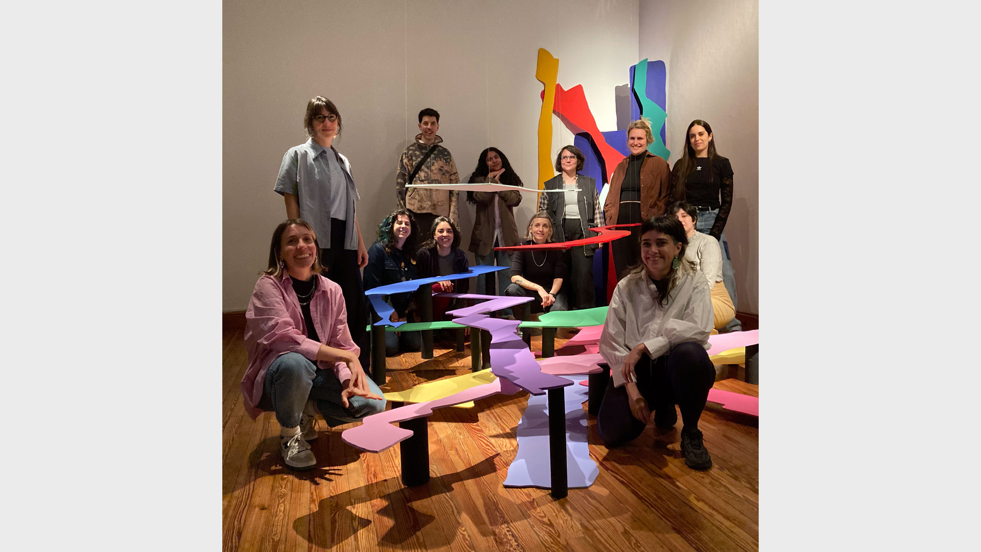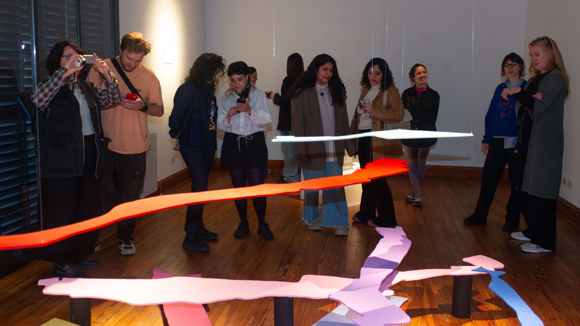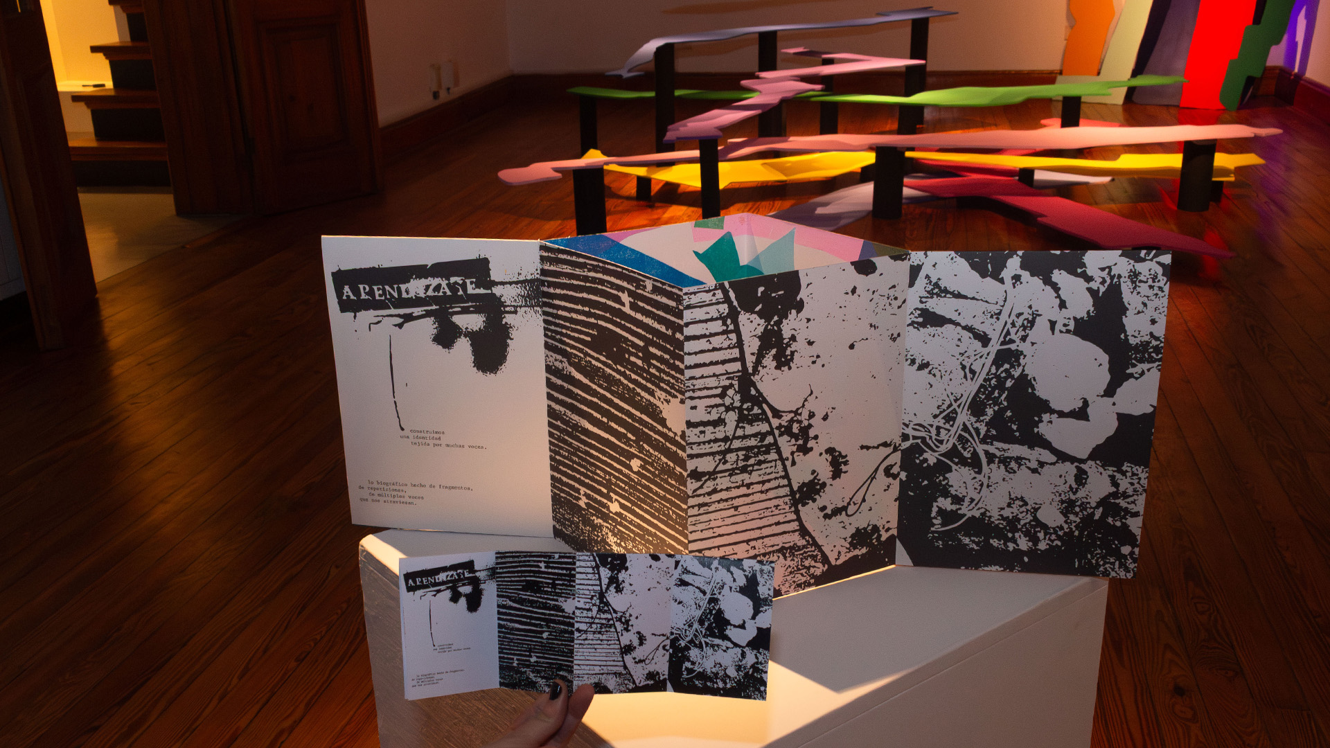 On the one hand, a site-specific installation made in monocopy with large pieces displayed in the space. These pieces, composed of MDF figures, were held in a floating state at varying heights, some of them suspended from the ceiling of the room. Each form reproduces the journey of the group members from their homes to and from the Fina Estampa workshop (directed by Mariana Gayoso, who together with Leticia Barbeito coordinates the C.O.P.I.A. Group), where the group has its headquarters.