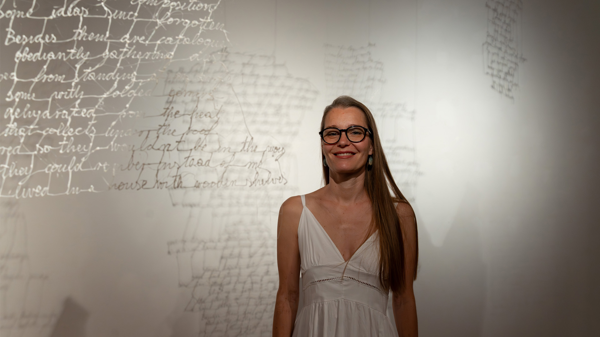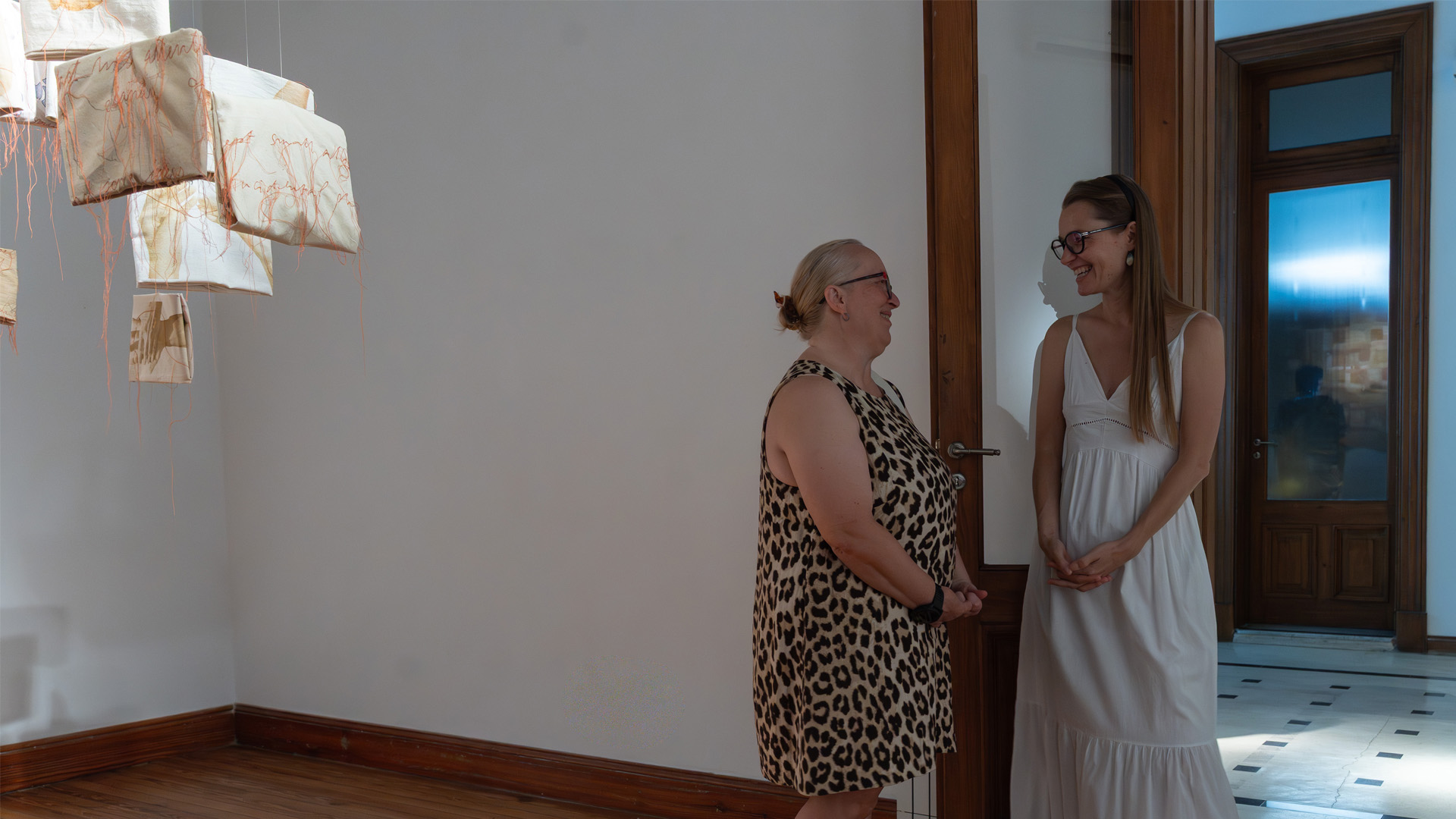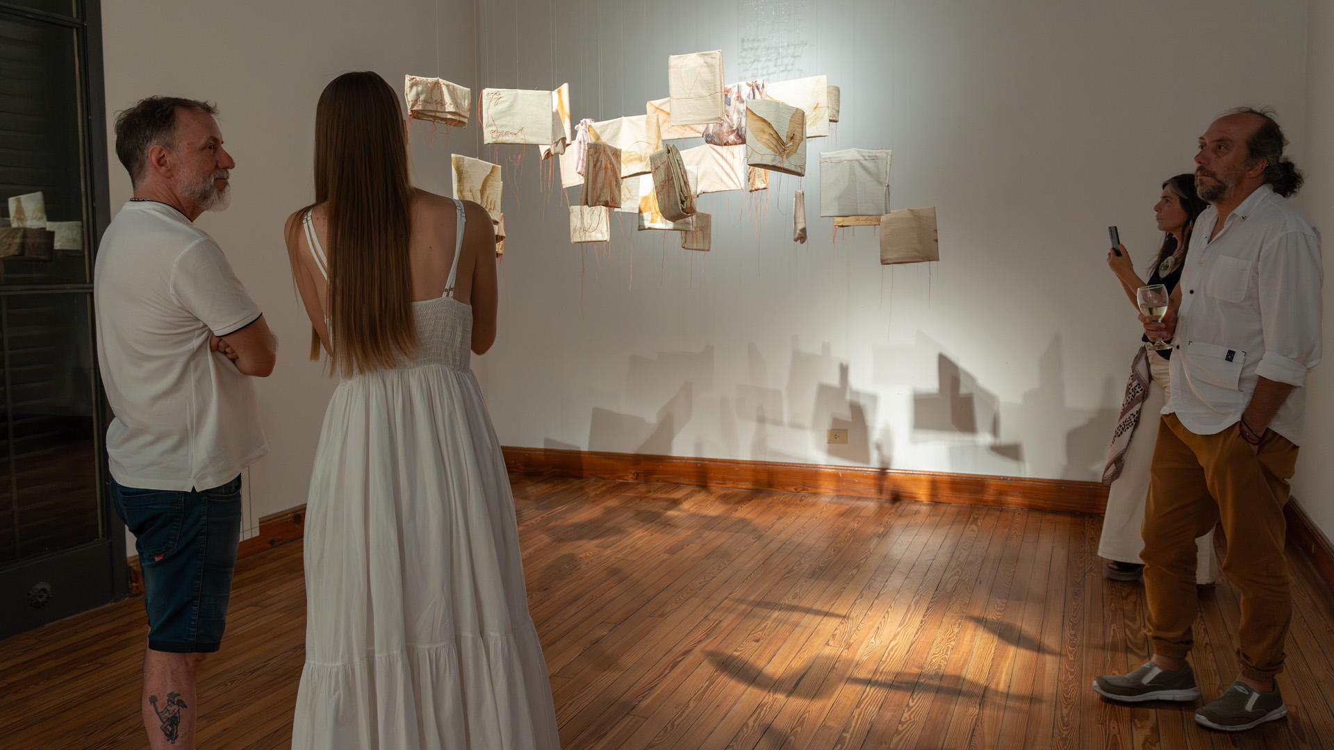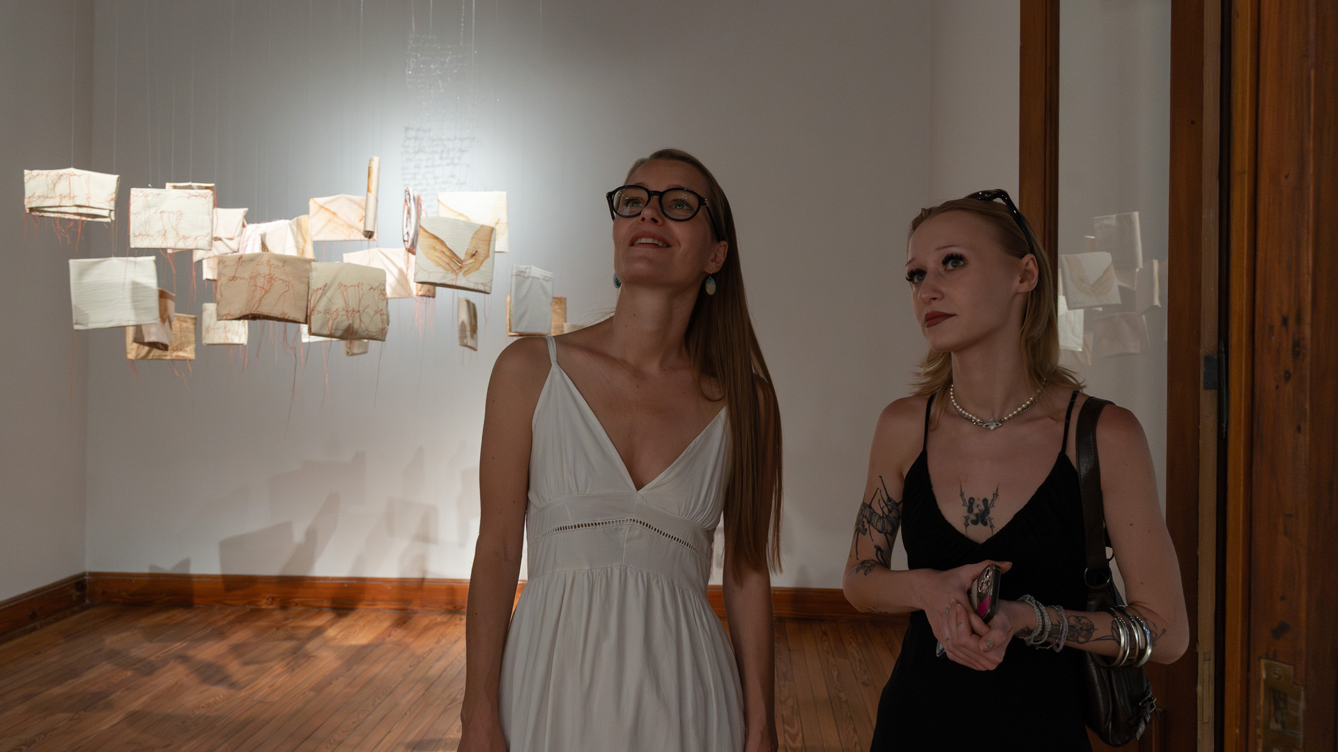 The pieces of worn nightgowns, emptied of the body, interconnected with poetic texts and objects with pairs of printed hands, entangled in fraying threads and continuing unfinished sentences, emphasize the relational nature of existence and a tender interdependence.