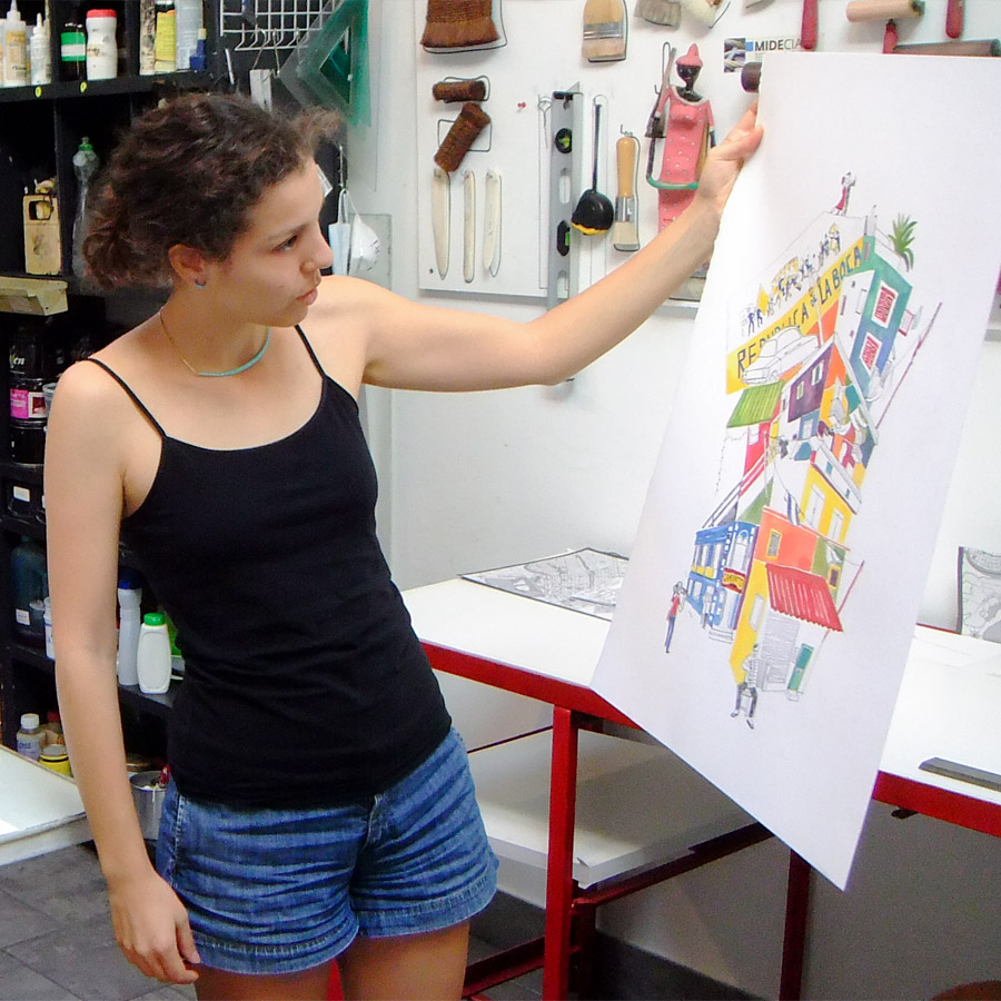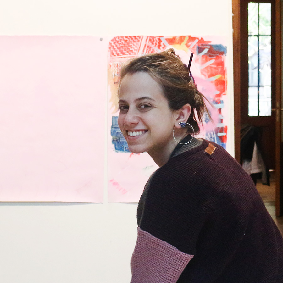 Zhino Yousefi (an Iranian-born, Canadian-raised artist now living in the United States) presented her installation Iranian Whispers: A Zen Garden in the Polyglot Room. Ardine Nelson shared the results of her stay in Buenos Aires, a presentation with the photographs she took of our local flowers and plants. and Fred Marsh showed the photolithographs that he made from a photographic series of cave paintings in the Dialogue Space. Geneviève LeDuc presented a pictorial intervention with colossal female figures guarding the 4 corners of the terrace space, as part of her Palimpsest Project mural painting residency. Finally, Ioulia Akhmadeeva shared with the local public, and with part of the Russian diaspora she interviewed in Buenos Aires, the process she carried out as part of her Production Residency researching Russian families who recently emigrated to Buenos Aires. Aires.